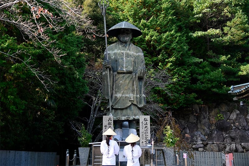 また、お遍路では本堂に参拝後、弘法大師をまつる大師堂でも同様に参拝を行います。その大師堂のそばには弘法大師像が。日本の真言宗の開祖である弘法大師は、民衆の平和を願い八十八の霊場で修行を行いました。これまで多くのお遍路さんを見守り、広く人々の信仰を集めてきた高僧です。
