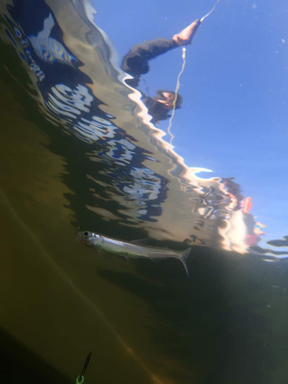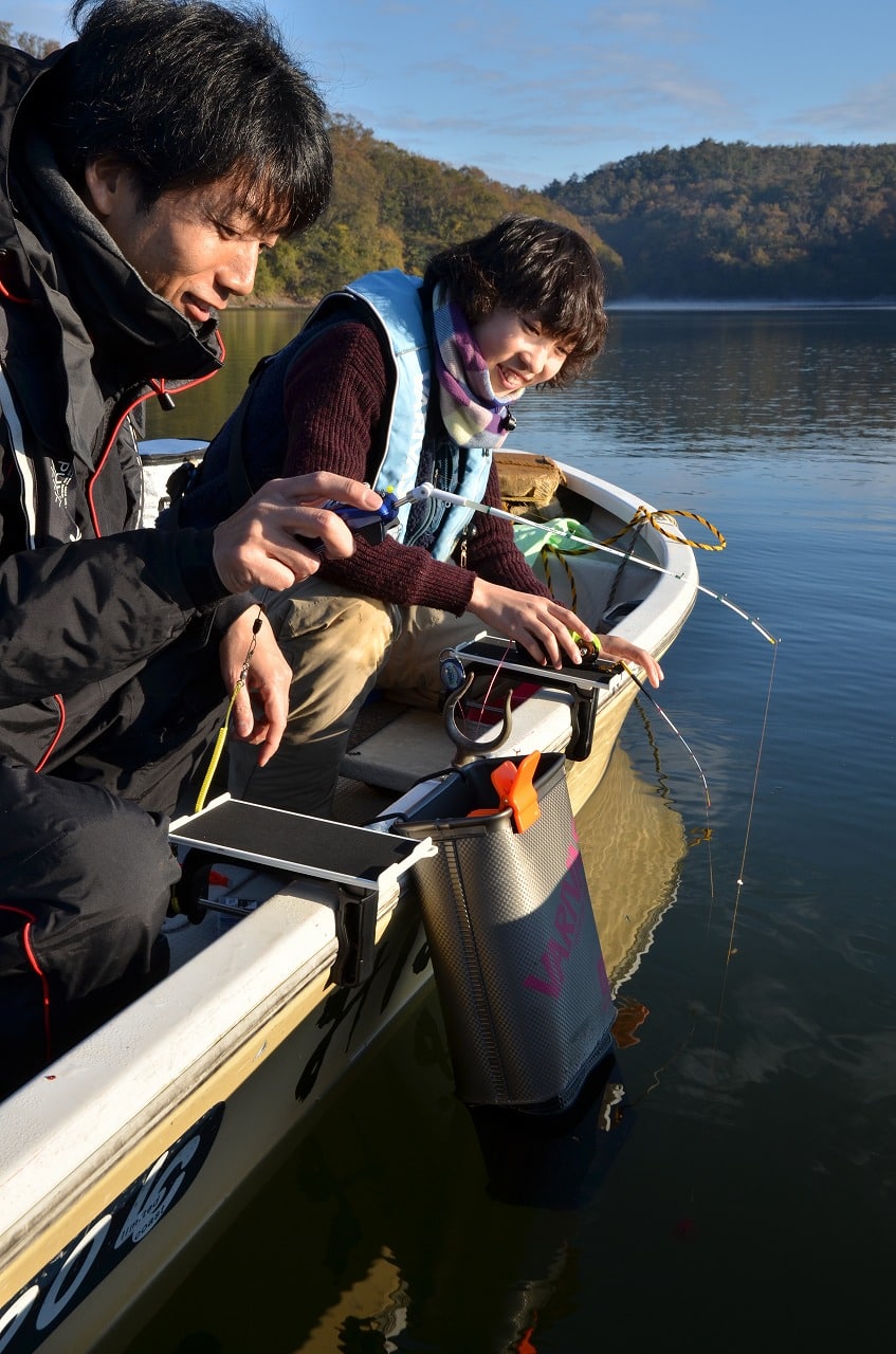 ポイントに到着したらアンカーを沈め、ボートが安定したところで釣りを開始。釣り方は、紅サシやアカムシというエサを付けた5~6本バリ仕掛けをワカサギの泳いでいる水深まで沈めてアタリを待つというもの。小バリなのでエサも小さく付けること。一番上のハリに集魚効果のあるタブレットやブドウムシを掛けておくと効果的だ。ワカサギがハリに掛かると穂先が明確に揺れるので、一定の速度でリールを巻いて手早くワカサギを抜き上げる。巻き上げの途中や水面でイトを弛めて暴れさせると簡単に外れてしまうので注意。1尾釣れた水深には同じように他のワカサギも泳いでいるので、エサの有無をチェックしたら再び同じ水深に仕掛けを入れる。レンタルタックルのリールにもカウンターが付いているので、その数字を参考にするといい。