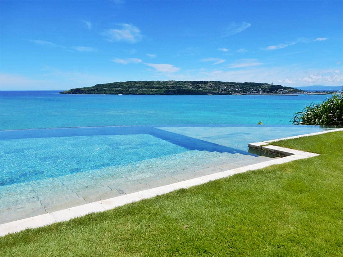 「chillma」を語る上で欠かせないのが、インフィニティプール。枠の見えない設計のプールは、まるで目の前に広がるエメラルドグリーンの海と繋がっているよう。ここがプールであることを忘れ、まるで大海に浮いているような解放感を味わえます。美しい海にぽっかりと浮かぶ古宇利島も望め、沖縄北部ならではの雄大な景色が、バカンス気分を高めてくれます。