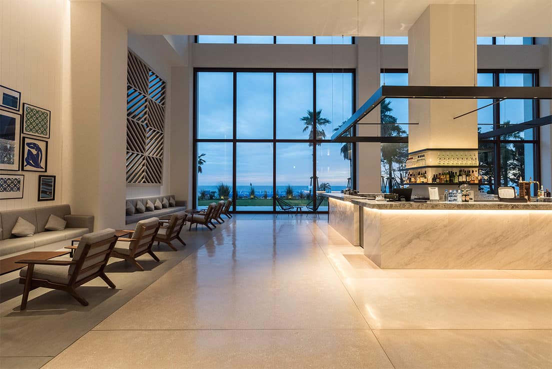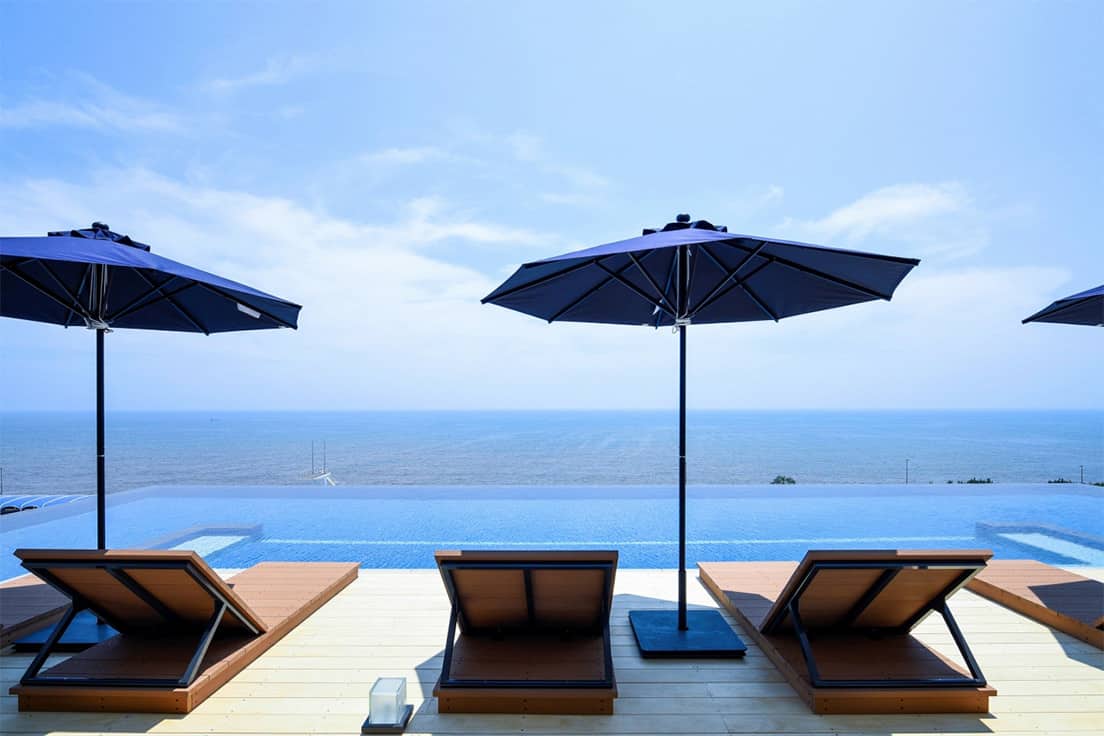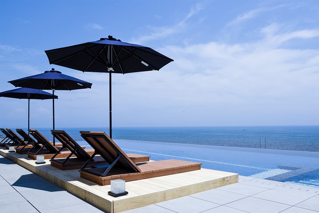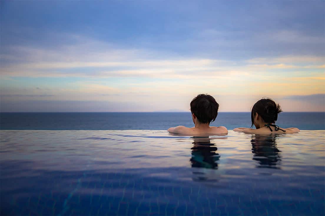 水平線に溶け込むようにデザインされたインフィニティプールは、プールと目の前に広がる太平洋の水面が一体化するように設計。まるで海を泳いでいるかのように、圧倒的な浮遊感を体験できます。青い海と青い空を眺めながら水に浮かぶ開放感に、日常のストレスや疲れがスルスルと消えていきそうです。