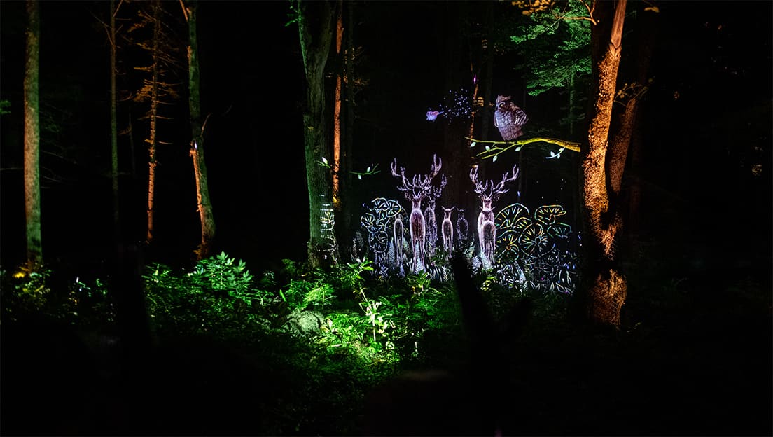 この夏、阿寒湖エリアではアイヌ文化と大自然をテーマにしたナイトショーが2つ開催されています。「カムイルミナ」は、阿寒湖の森を舞台に、ナイトウォークしながら自然とイルミネーションショーでアイヌ文化を体感するイベント。アイヌの杖であるリズムスティックを手にして、自らが人間界を救うために森へ入っていきます。森に映る光と物語に誘われ、勇者になりきるプログラムは、子供のいる家族におすすめです。