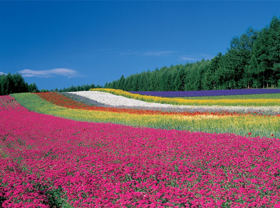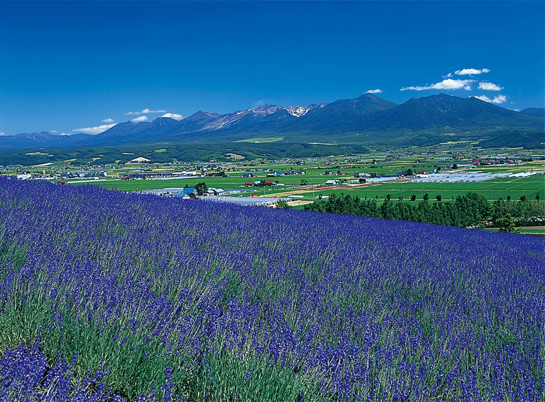 「ファーム富田」は、ラベンダー畑が点在する富良野エリアのなかでも指折りの人気観光スポットです。園内に3つあるラベンダー畑には、「おかむらさき」や「はなもいわ」、「濃紫早咲」といったさまざまな品種が紫の絨毯を織りなしており、畑の上まで登れば、風に揺れるラベンダーの向こうに富良野盆地の田園風景と十勝岳連峰までもが一望できます。