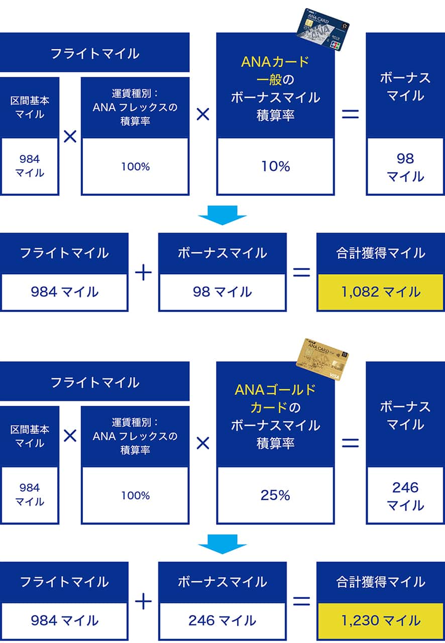 ANAカードを利用すれば、1回のフライトでボーナスマイルとフライトマイルが合算されるので、先ほどの例では「ANAカード一般」で1,082マイル、「ANAゴールドカード」なら1,230マイルも貯まります。