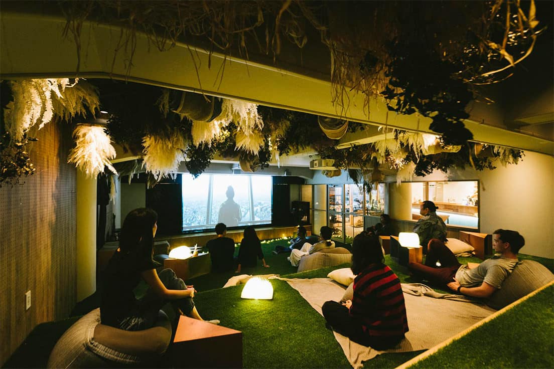 映画館と自宅での映画鑑賞の違いは、見知らぬ人々と同じ作品を一緒になって観られる一体感にあります。シアターズィーのコンセプトもそれ。屋外劇場をイメージした広さ150平方メートルの芝生カーペットにクッションがいくつか用意され、そこで映画を観ることができます。国籍や年齢、性別を超えて、ともに作品やイベントを楽しめるのが醍醐味。単にホテルに泊まるのとはひと味違う、宿泊体験ができます。