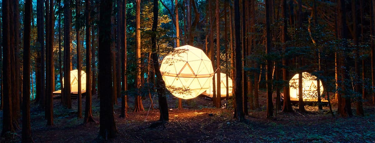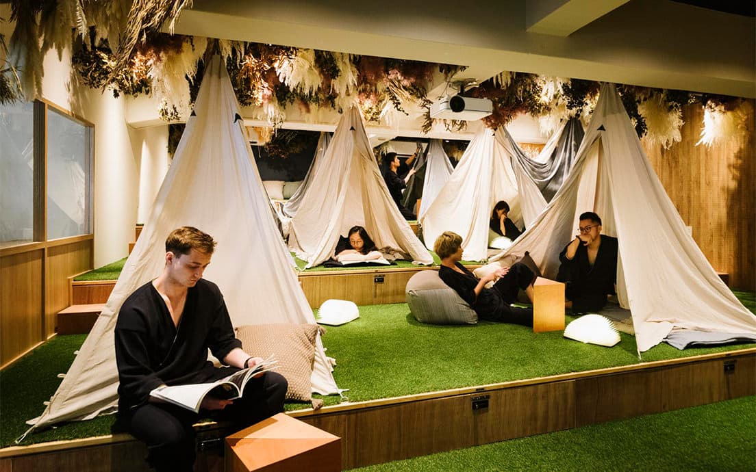 Theater Zzz(シアターズィー)の客室に個室はなく、室内にテントを吊り下げた開放的なスタイル。一人で泊まりたい方向けにはソロキャンプスタイルの1人用のテント、2〜3人向けには大きめのテントが用意され、お気に入りの場所で思い思いの夜を過ごすことができます。一緒に時間を過ごす仲間との宿泊も楽しいものです。