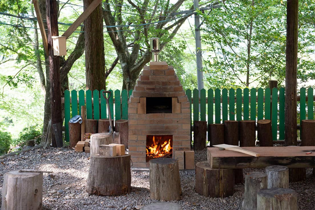 敷地内には炊事棟やピザ窯があり、大自然の中でバーベキューやアウトドアごはん、ピザを楽しむことができます。焚き火台もレンタル可能で、ユニフレームの焚き火台が1泊1,000円(税込)。薪は500円(税込)で購入できます。大自然の日常空間で、薪をいろんな形にカッティングして非日常の焚き火体験をしてみましょう。