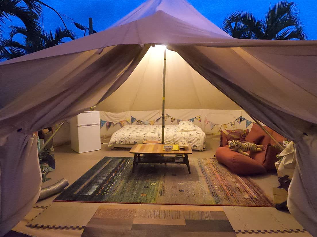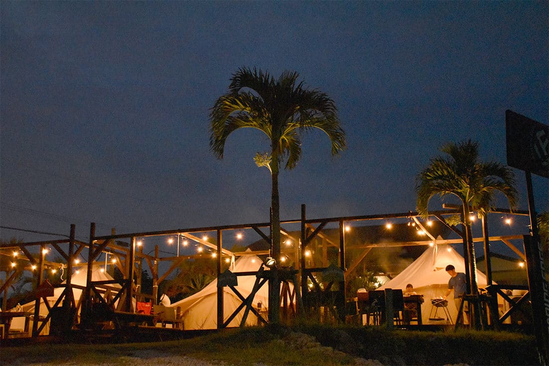 沖縄の美ら海水族館の近くにある「美ら海ビレッジ」は、沖縄北部・やんばるの大自然を満喫できるリゾート施設。施設内は1号店から3号店に分かれており、それぞれ戸建てタイプが中心ですが、2号店には2組限定のグランピングスタイルの宿泊施設もあります。