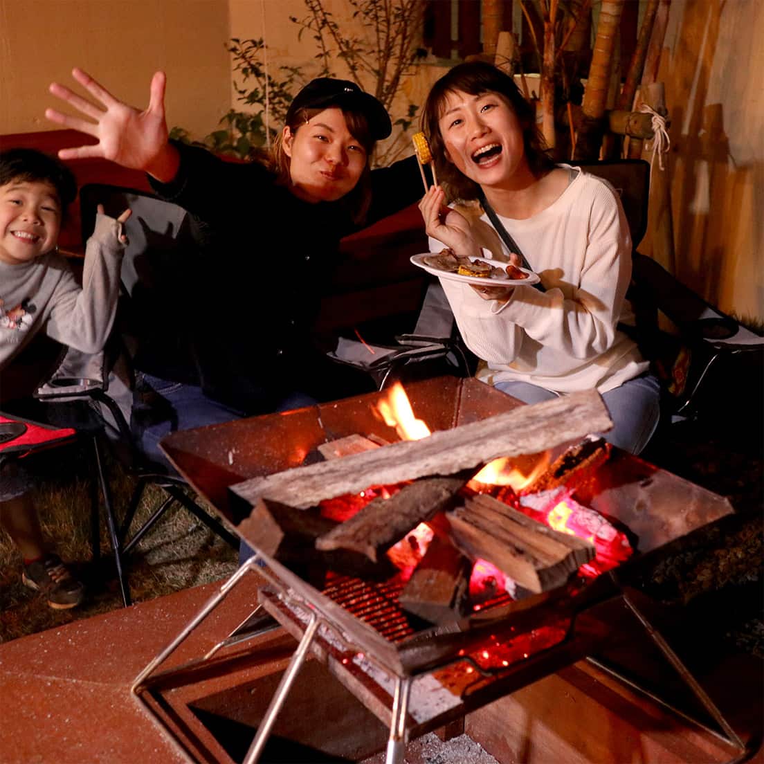 焚き火台と薪も用意されていて、焚き火台と薪、スモアがセットで2,500円(税込)。ロースタイルの焚き火台を好きな台数だけ借りることができます。初心者でも手軽で贅沢にアウトドアライフを楽しめるのが、グランピングの良さ。スモアセット(マシュマロ、ビスケット、チョコレート)は、マシュマロとチョコレートをビスケットで挟んでいただくためのセット。子供達の喜ぶ顔が見られるのはもちろん、大人もウイスキーにあわせて楽しむことができます。