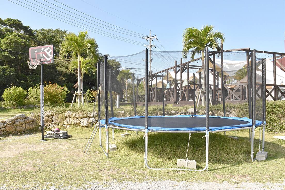 施設内には、トランポリンや砂場、バスケットボールを楽しめる広場があります。また、近くには海があり、シュノーケル遊びをすることも。グランピングで夜空を見て、日中は海で過ごし、沖縄の夏を満喫するのにぴったりのスポットです。