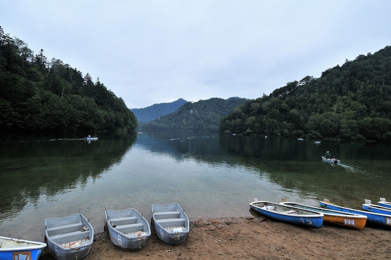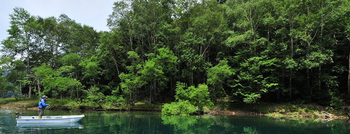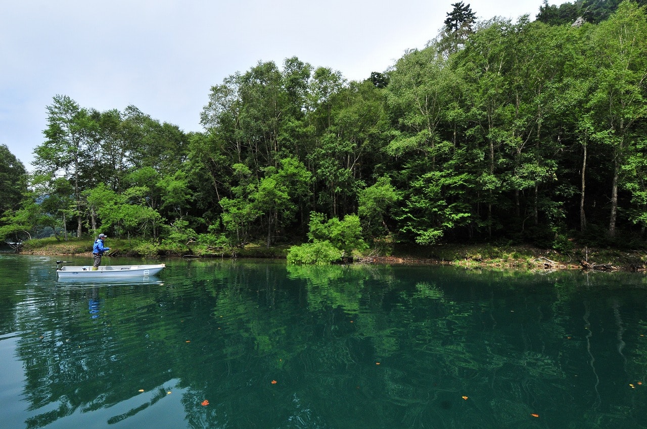 一帯は冬になると積雪が2mを超える豪雪地です。人の手が必要最低限しか入っていない自然に囲まれると思わず息を呑みます。沼の水深は最も深いところで67m。湖岸線は14kmで、透明度は15mと非常に高いのが特徴です。魚類はニジマスのほかに、イワナ、ウグイ、ヒメマスの姿も見られますが、一番人気はやはりニジマス。澄んだ水の中で育つことにより、「グリーンバック」と呼ばれる、背中が緑がかった特徴な体の色になります。