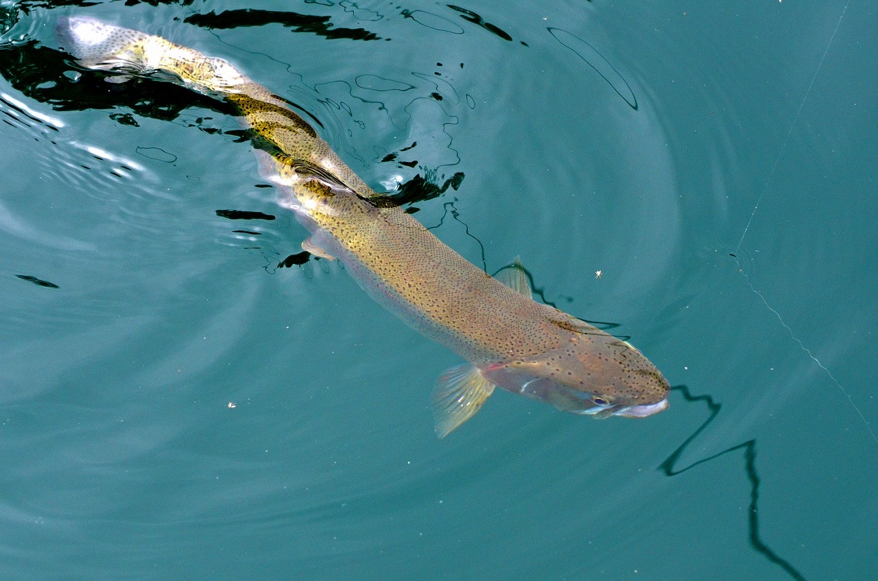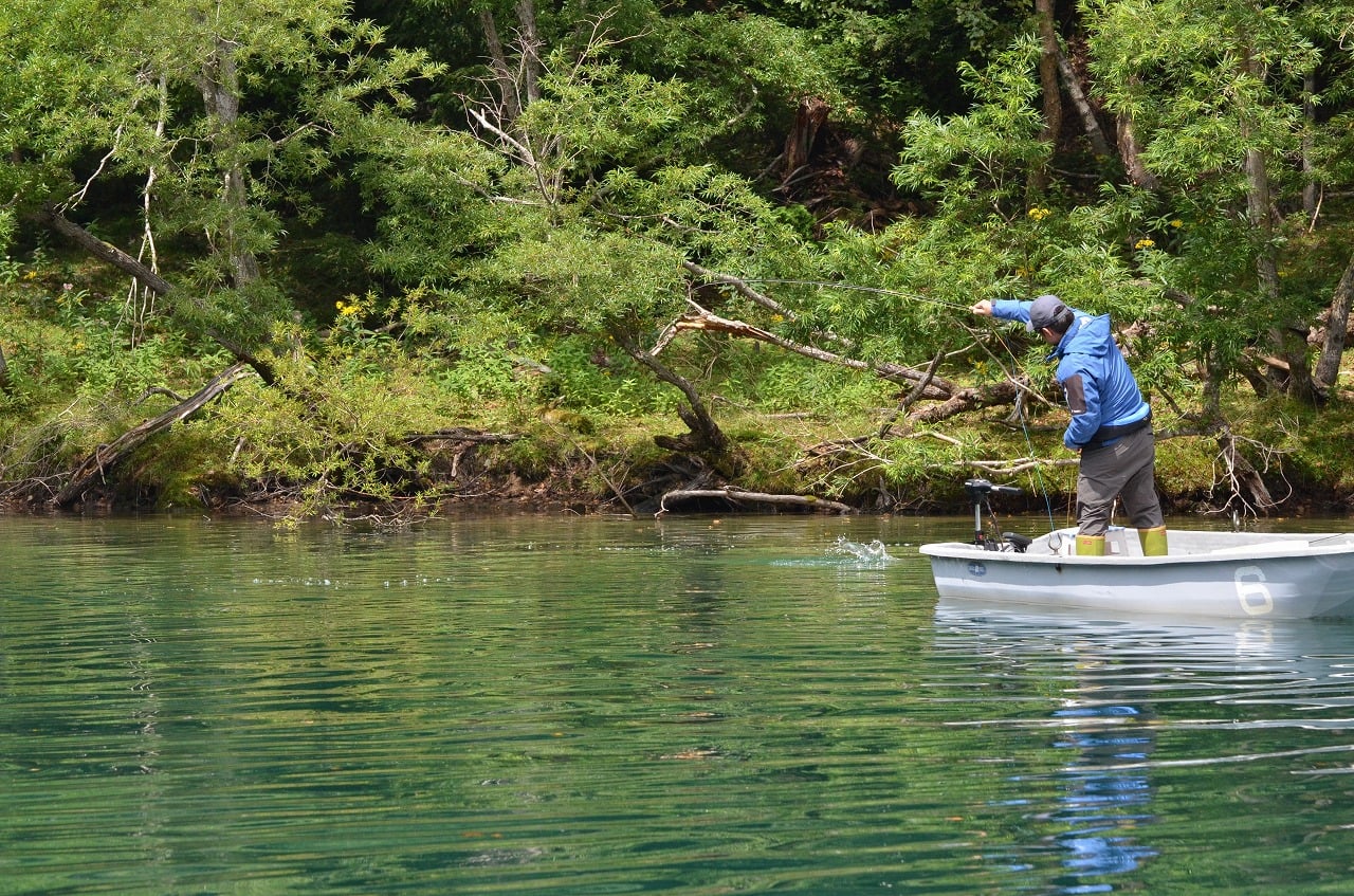 木の枝がせり出しているような場所にボートで近づき、湖岸に沿って泳ぐニジマスを探します。姿を見つけたらその鼻先にフライをキャストして浮かべると、水面に浮かぶ昆虫だと思ったニジマスが近づいてきて、バシャっと勢いよく食い付きます。菅沼のニジマスは50cm前後の大型も多いので、一連の動きを目で追う釣りは非常に興奮します。