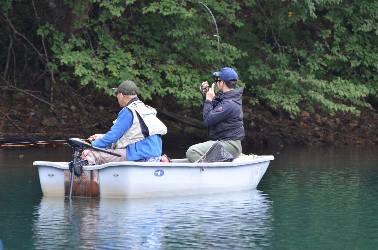 菅沼の釣りは手漕ぎボートを使います。釣り方はルアーフィッシングおよびフライフィッシングのみで、釣れた魚はすべてキャッチ&リリース(再放流)するのがルールです。フック(ハリ)はどちらの場合でも、イカリバリではないシングルフックで、なおかつカエシのないバーブレスフックを使うのが決まりです。