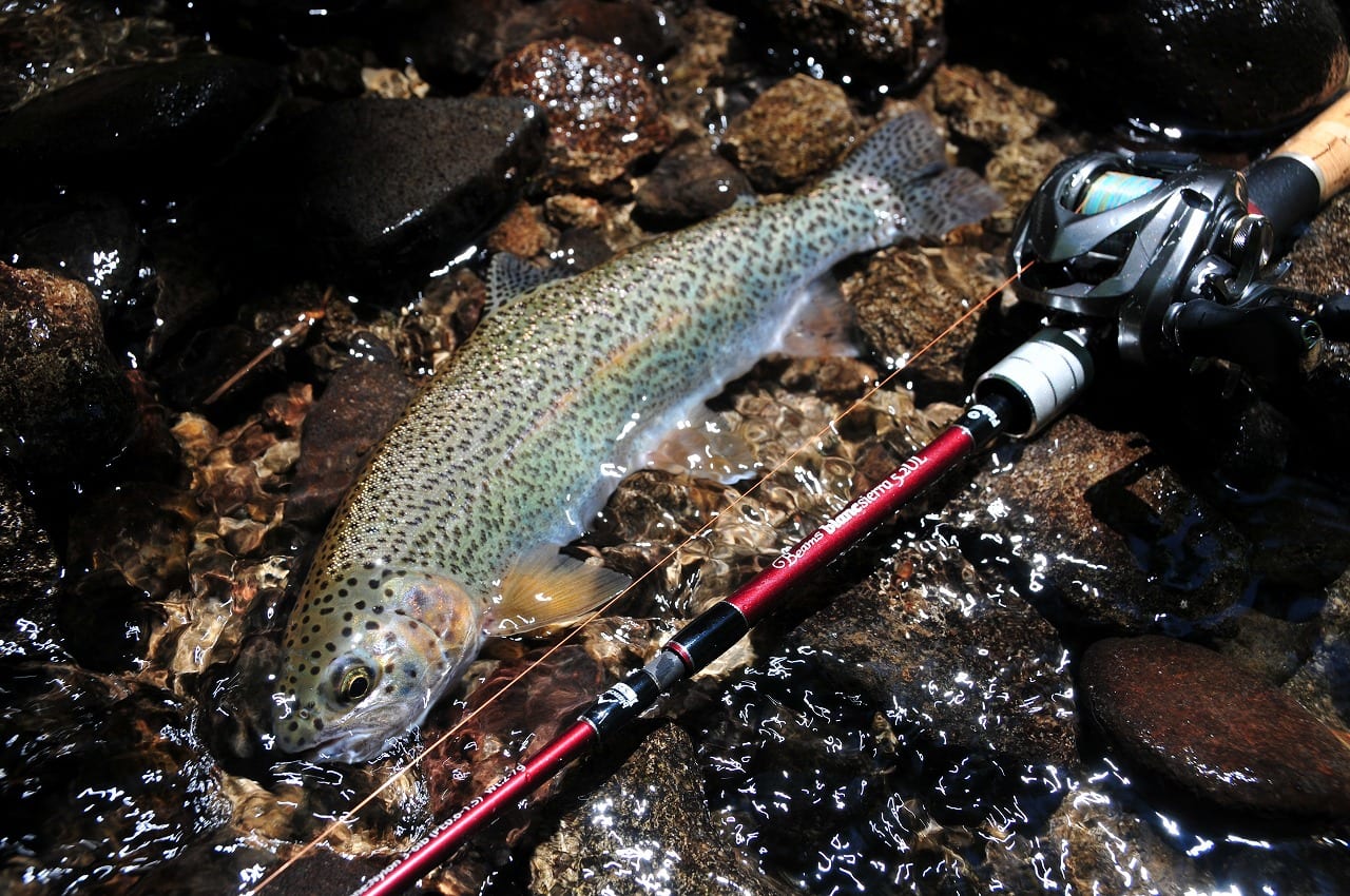 さらに川をさかのぼると、今度は尺(30cm)クラスのアメマスがヒットしました。岸際や倒木下などの狙った場所に、吸い込まれていくように入っていくルアー。そしてリールを巻いてアクションを加えると、ガツンという手応えとともに魚の躍動感が手に伝わります。この感覚は、何度味わっても飽きません。