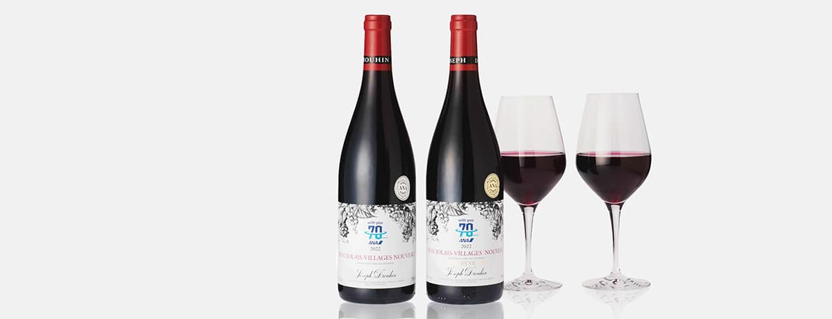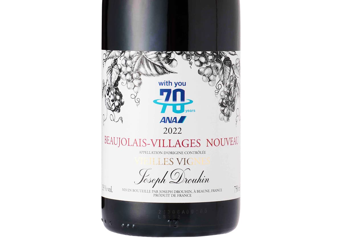 このメゾン・ジョゼフ・ドルーアンの2本立ては、取り扱い開始当初から変わらないそうです。「毎年好評をいただいており、リピーターのお客様も多いですね。今年はANA創立70周年ですので、お客様にとって年に1回のボジョレー・ヌーヴォーをより特別感のあるものにしていただきたいという思いもあり、ラベルについては従来とデザインのタッチや色合いを一新しています」