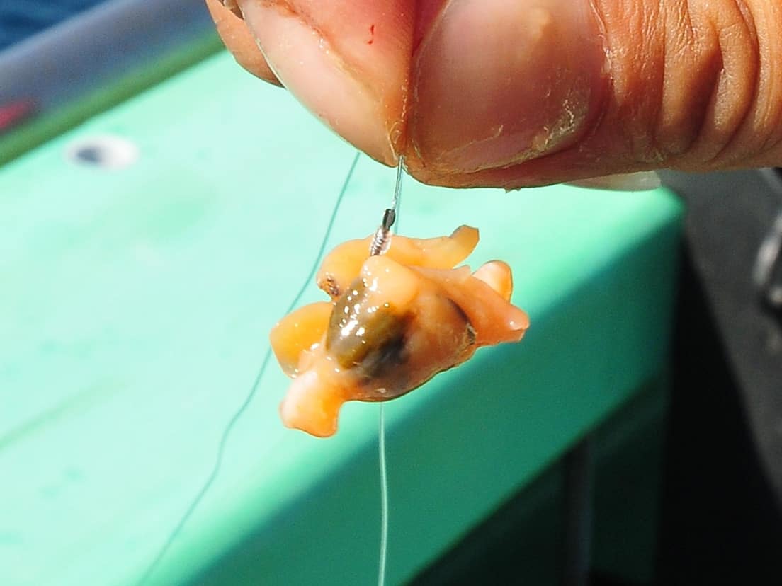 1つは「ていねいなエサ付け」です。カワハギはアサリの中でも黒いキモの部分を最も好んで食べます。そこでエサを食べに来たカワハギの口が必ずハリに触れるように、最後は必ずハリ先がキモに刺さるようにエサ付けをします。