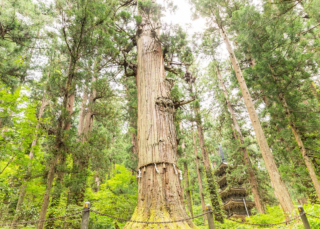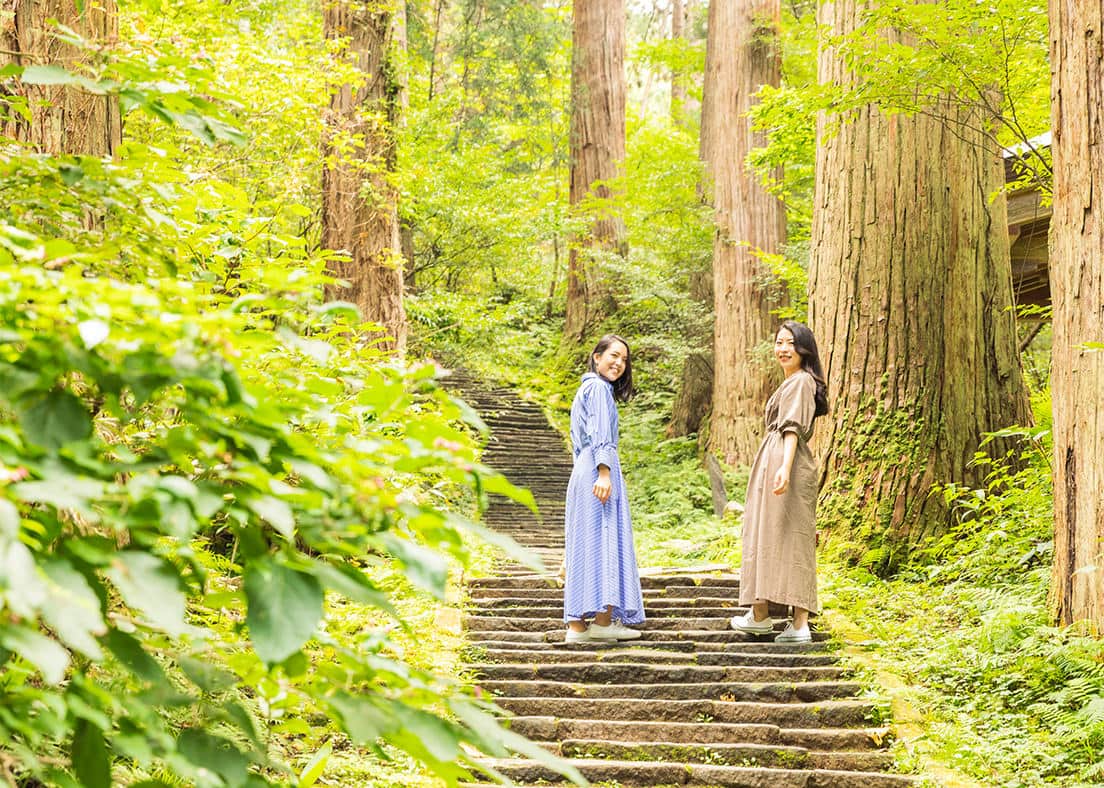 2日目は、日本遺産である「出羽三山(でわさんざん)」の散策からスタート。羽黒山(はぐろさん)、月山(がっさん)、湯殿山(ゆどのさん)から成る「出羽三山」。この3つの山を巡ることは、死と再生 をたどる「生まれかわりの旅」といわれているそうです。羽黒山が「現在利益を授かる山」、月山が「死後の世界を表す過去世の山」、湯殿山が「死後の世界を表す過去世の山」といわれており、今回は羽黒山を散策してみることに。