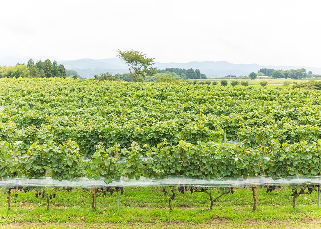 松ヶ岡開墾場周辺にはもともと、蚕の餌である桑がたくさん植えられていました。オーナーがイタリアの世界遺産「ランゲの丘」を訪問した際、アルプスをバックに一面のブドウ畑の風景が月山をバックにした松ヶ岡と重なり、「松ヶ岡をブドウ畑にしたい」と思ったことがきっかけで、2017年に初めてワイン用のブドウを植えたそうです。現在は2つのエリア6ヶ所の畑で8種類、約8,000本のブドウが栽培されているのだとか。