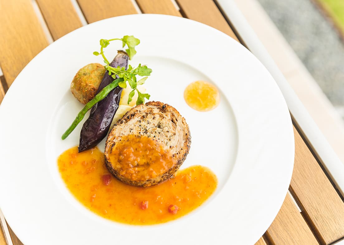 「肉+肉という見た目ですが、お肉のしつこさはまったくなく、絶妙にジューシー。アラボロネーゼのソースも絶品でしたが、添えられていたアンデスメロンのジャムをつけてもおいしかったです。付け合せのナスの素揚げもいいアクセントで、大満足でした」(緒方CA)