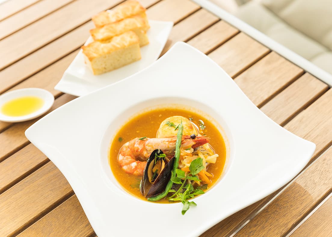 「コクとうま味がたっぷりのブイヤベースでした。もっちり、みっちりとしたフォカッチャともよく合って、おかわりしたくなったほど。このフォカッチャは鶴岡シルクパウダーと米粉が入っているんですね」(山下CA)