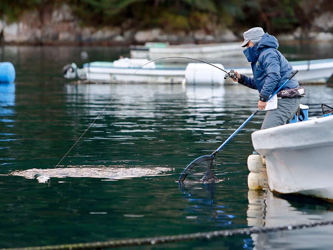 迎えが来たところで荷物を一度積み直し、湾内を数百メートル移動。マダイの養殖イケスの1つに固定されたカセに移ります。釣りをするのはイケスと反対の開けた側ですが、養殖イケスには定期的にエサが撒かれるため、それらにつられて他の魚も寄って来るのです。カセはイカダに比べれば半分以下の広さですが、釣り人の数だけ用意されているのでスペースには十分余裕があります。また穏やかな湾内なので揺れることもほとんどありません。