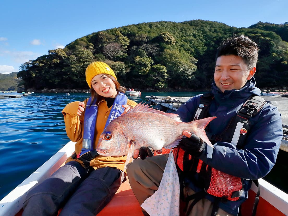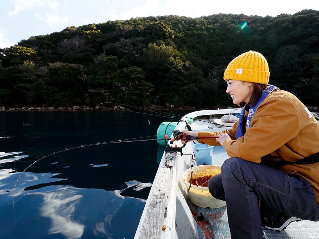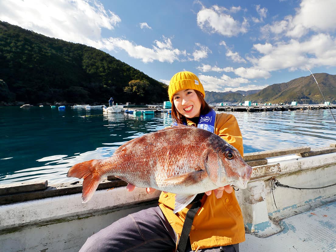 「こんなにきれいない色のマダイは初めてかも!」と、万里奈さんも驚く本命でした。ただ、この後はなかなか釣れない時間が続きます。三木浦のマダイは1年を通じてねらえ、5~6月には70cmオーバーの実績も多数ありますが、低水温期の今は簡単には行きません。1日目を終え、どうすれば少しでもチャンスが広げられるかを考えた万里奈さん。決めたのは、慣れないフカセ釣りではなく、持参していた船釣り用の道具でじっくり集中し続けることでした。地元の釣りエサ店にあらかじめ電話で相談した際、「水深が30~40mある状況なら、そうした釣り方も十分にチャンスはあるはず」と確認していたことも決め手になりました。