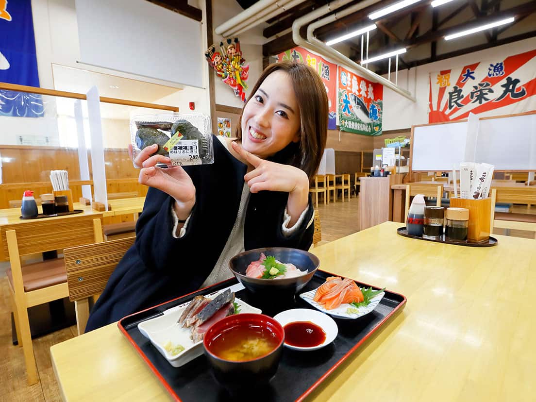 こうして三木浦の海を満喫した万里奈さん。お昼は尾鷲の市内にある「おわせお魚いちばおとと」に足を伸ばしてランチを楽しみ、樹齢1千年以上といわれる大楠がそびえる尾鷲神社にもお参りします。