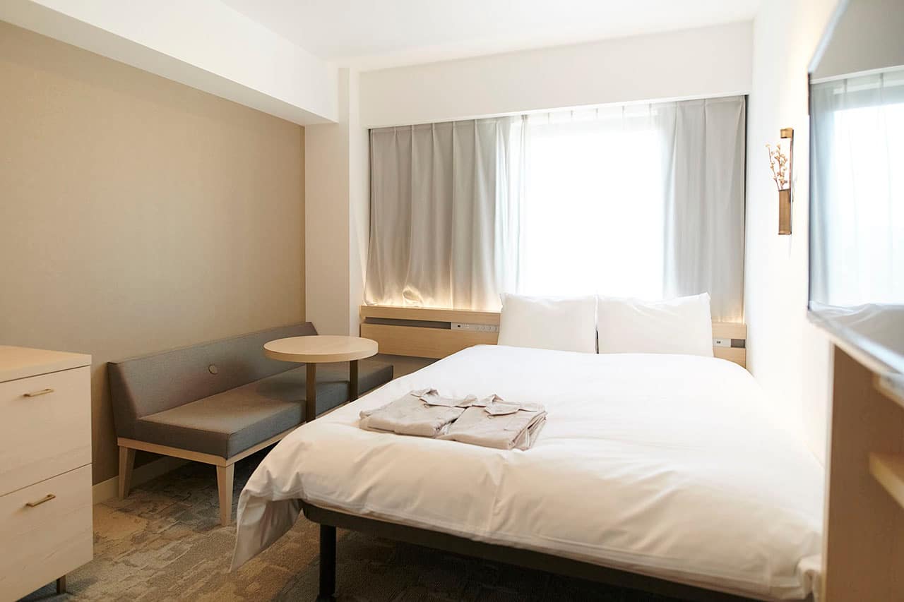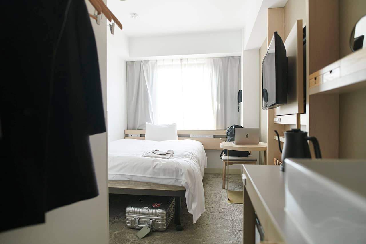 客室のインテリアはシンプルモダン。什器(じゅうき)や小物入れ、小テーブルなどに白木が使われ、フロント同様、明るく温かみのある雰囲気です。ベッド周りの欲しいところにコンセントやUSBの差し込み口が設けられていたり、ベッド下にスーツケースなどの荷物が置けたり、洗面台をリビング側に置くなど、コンパクトな客室を快適に使いこなせるような工夫が随所に施されています。
