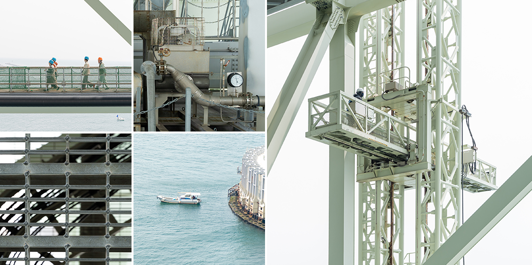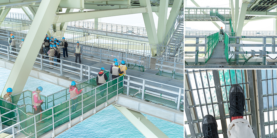 一般の観光客でも入れる回遊式通路を抜けると、いよいよ床がグレーチングの管理路に出る。