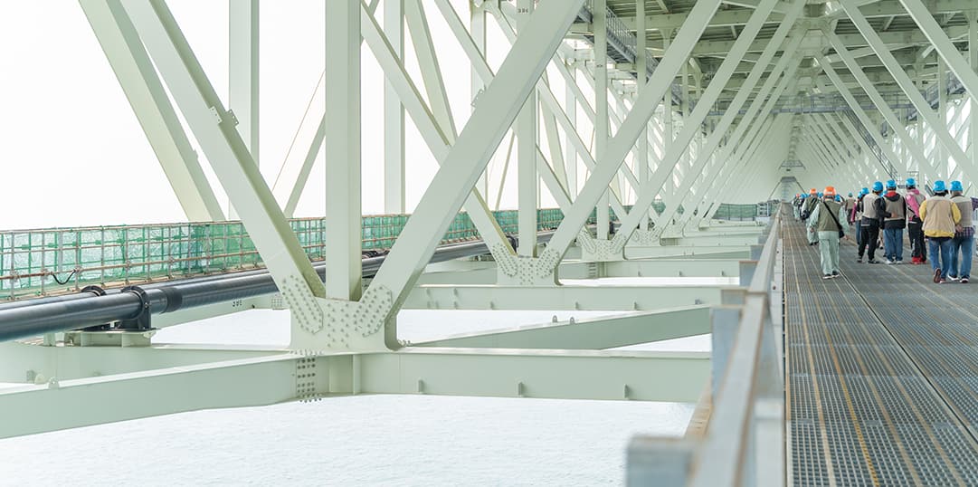 橋の下では点検も欠かせないため、作業車両が通れるように幅広の通路になっている。