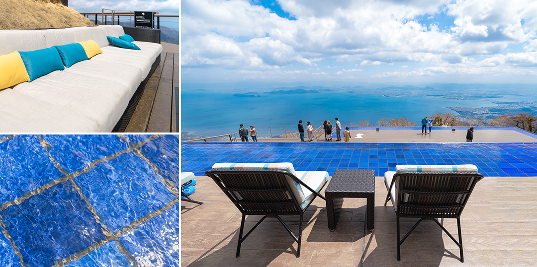 水盤の先に広がる琵琶湖の風景は、まさに絶景。