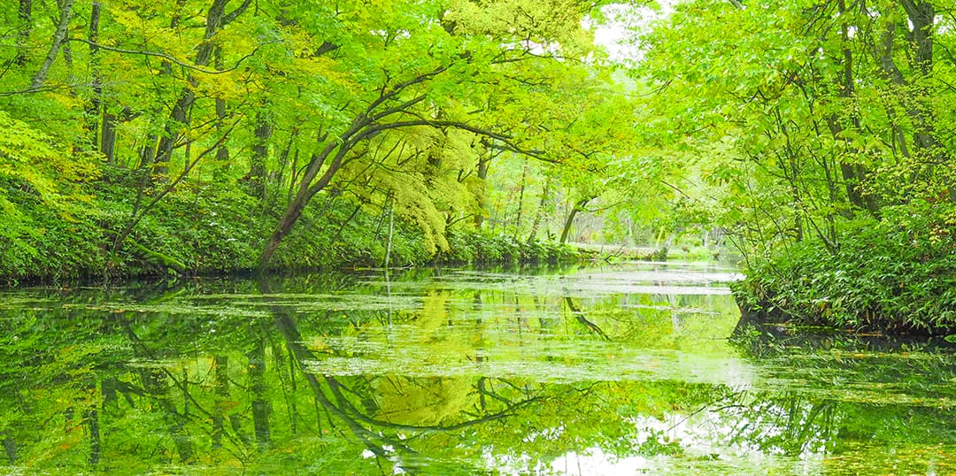 木漏れ日の散策路を越えると幻想的で美しい緑の水面が待っている。