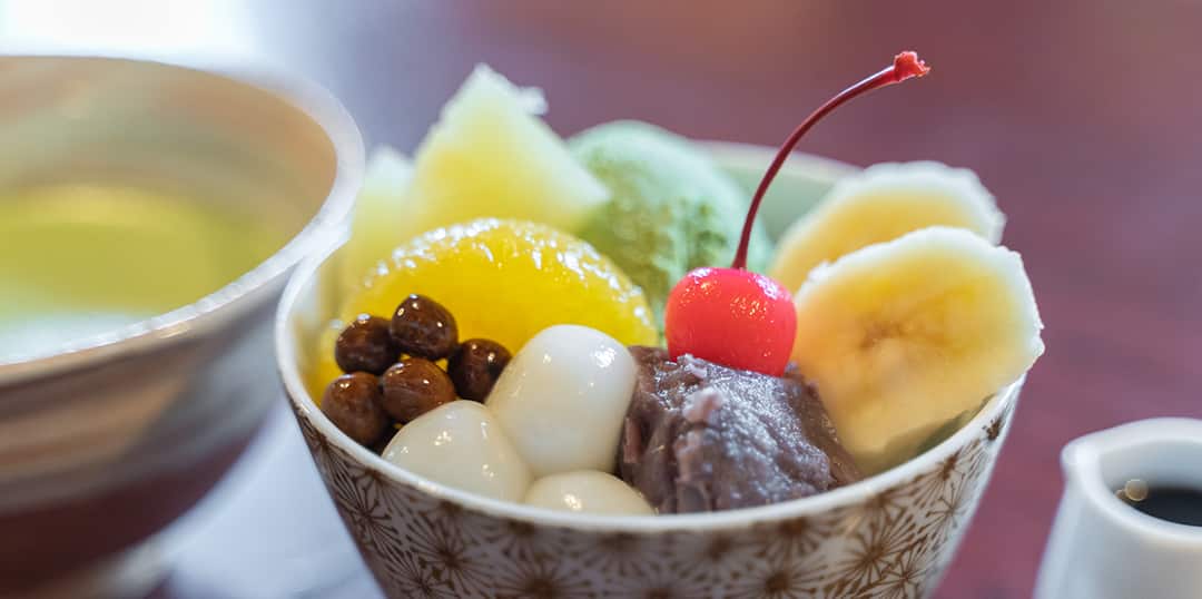 あんみつと抹茶のセットのほか、ロールケーキやパフェなど