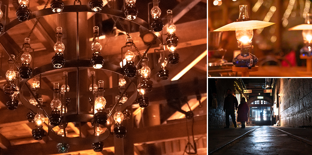 はじめはその暗さに驚くが、次第に目が慣れるとランプの優しい光が広がっていく。