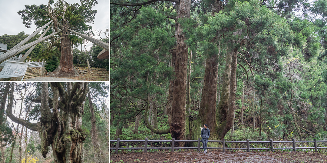 樹齢2000年とも⾔われる「⼋百杉」、根元付近から6本の幹に分かれた「かぶら杉」。