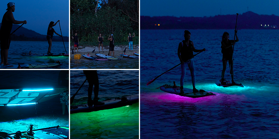 日が暮れるとSUPも夜の顔に。LEDライトを施した鮮やかな夜の船。