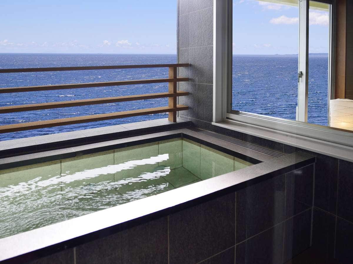 「鴨川温泉が楽しめる貸し切り露天風呂のほか、露天風呂付きの客室が29室用意されているので、家族だけで気兼ねなく温泉を楽しみたい方はぜひこちらへ。ホテルの6階、7階にあるプレミアムフロアは、すべて露天風呂付きで、いずれのお部屋からも海が一望でき、太平洋の雄大なパノラマを楽しむことができます」(同)