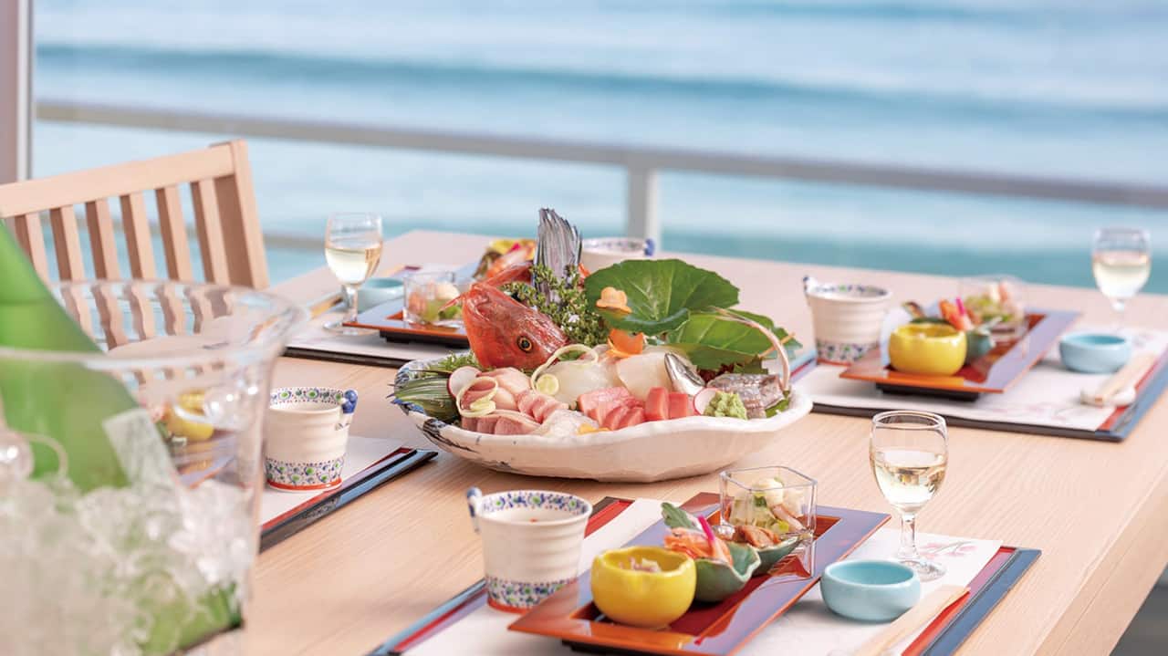 「プレミアムフロアでは、部屋食を選ぶことができるのもうれしいポイント。お部屋でまったりと、家族や親しい友人と気兼ねなく食事を楽しむことができます。"千葉県の名工"に選ばれた、渡辺正美料理長が手掛けるのは、地元の海の幸を中心とした美しい和食の数々。海を眺めながら、家族水入らずの夜を過ごしてみてください」(同)