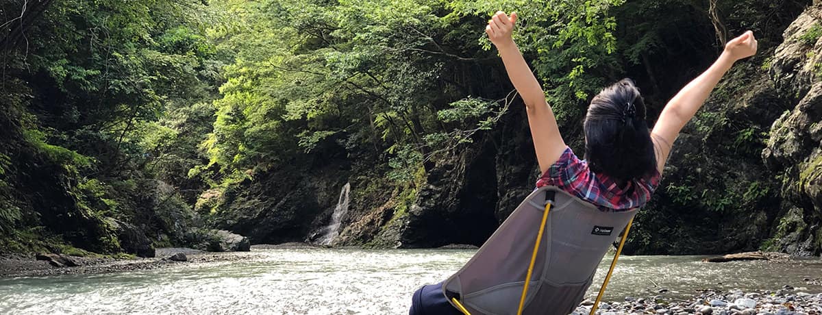 秋川渓谷とは、多摩川最大の支流・秋川の流れる、あきる野市から檜原村に至る全長20kmのエリアを指します。東京とは思えない大自然のなか、清流の音を聴きながら、人の少ない水辺でおいしい空気を吸いながらチェアリングができます。夏は浅瀬に椅子を置いて、足を水につけながらのんびりと過ごしてみましょう。飲み物やお弁当を持ち込んだり、読書したりすれば、静かで楽しい時間が訪れます。