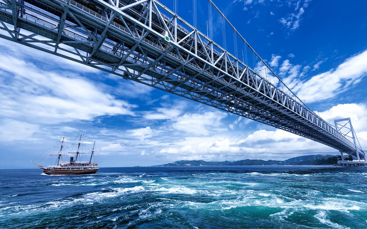 鳴門海峡の渦潮は、春・秋の大潮の時期になると全長20mと世界最大級のスケールに。