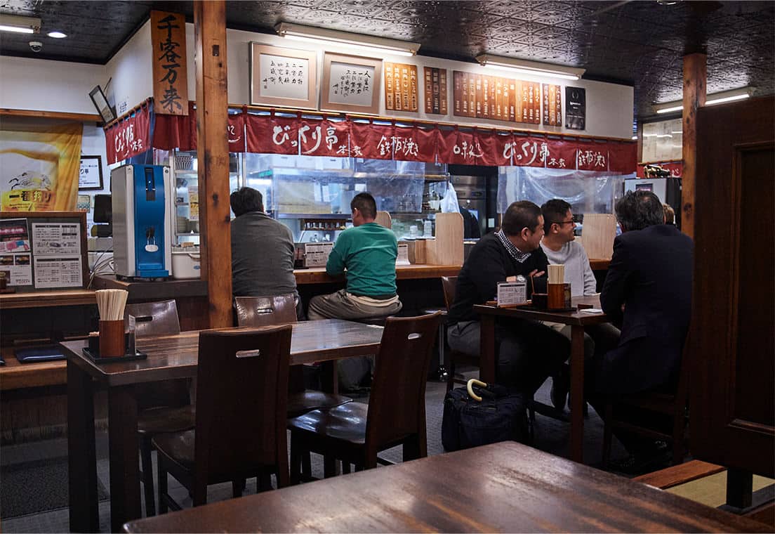 昭和38年、南福岡で誕生した「びっくり亭本家」。場所は「南福岡」駅のすぐそばで、色褪せた看板がその歴史を物語っています。入店すると、たちまち鼻をつくのが食欲をそそるニンニクの香り。ローカル感漂う昔ながらの大衆食堂の雰囲気とあいまって、これから対面するご当地B級グルメへの期待がおのずと高まります。