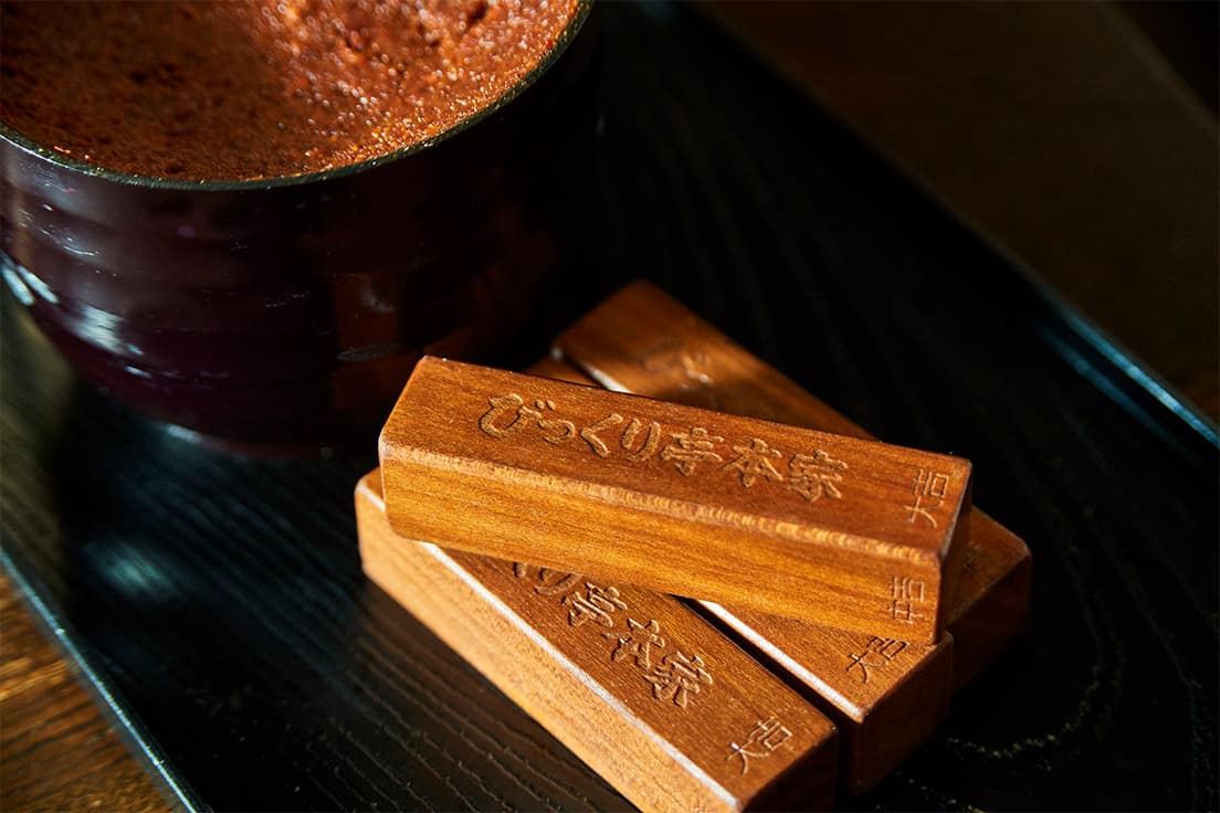 さっそく「いただきます」とお箸を取ろうとすると、その脇にジェンガのような木の棒を発見。実はこれ、「びっくり亭」の焼肉をおいしく食べるための必須アイテムなのです。この木の棒を鉄板の片方の下に挟んで傾かせ、脂が溜まった所に特製の辛味噌を溶かして「タレ」を作り、そこに焼肉を絡めていただくのがここでの流儀だそう。