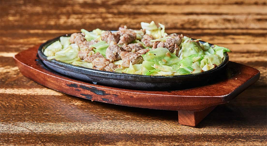 メニューは「焼肉」1つのみ。1人前、1人半前、2人前、3人前から選べますが、1人前で150グラムとなかなかのボリュームです。具材は豚肉のハラミとキャベツのみで、鉄鍋で炒めた肉とキャベツに、たっぷりのニンニクと塩と独自の調味料を絡めた秘伝のレシピで味付け。熱々の鉄板の上で、ジュージューと音を立てながら運ばれてくる焼肉のパンチの効いたニオイだけで、ごはんがすすみます。