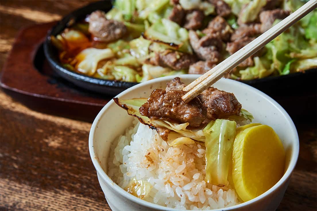 一口頬張ると、ガツンと口に広がるニンニクの風味と肉のうまみに食欲が加速。ほんのり焦げたキャベツも脂とタレを吸っていい塩梅で、肉と双璧のバランスに。堪らず白米をかき込めば、焼肉と白米の無限ループに突入。たっぷりのボリュームも、無我夢中であっという間に平らげてしまいました。