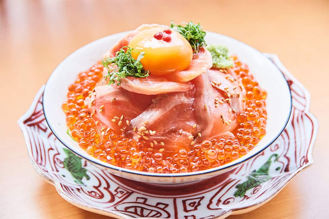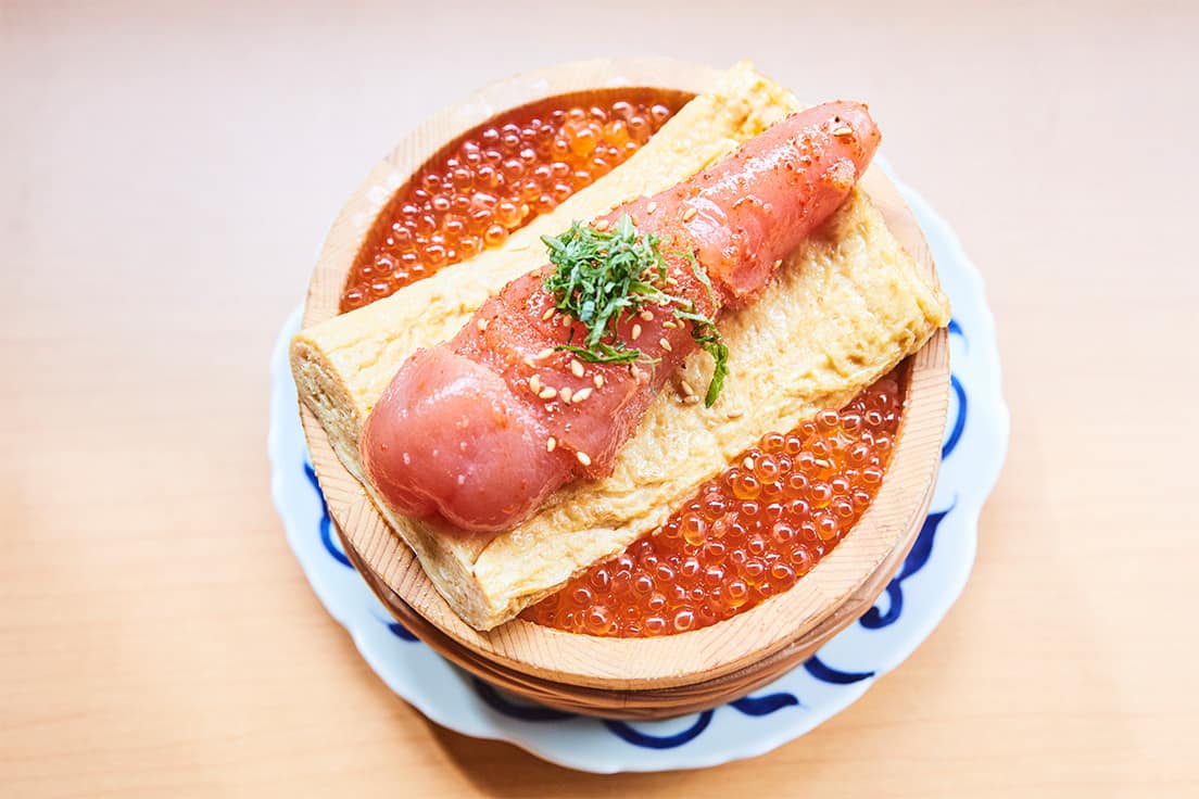 驚くのは、別名“痛風丼”と呼ばれる大胆豪華なそのビジュアル。たっぷり敷き詰められたイクラの上に、大きな出汁巻き玉子がドーンと1枚、その上に太い明太子をどかっと1本乗っけた「卵」オンパレードの盛り付けに目を奪われます。