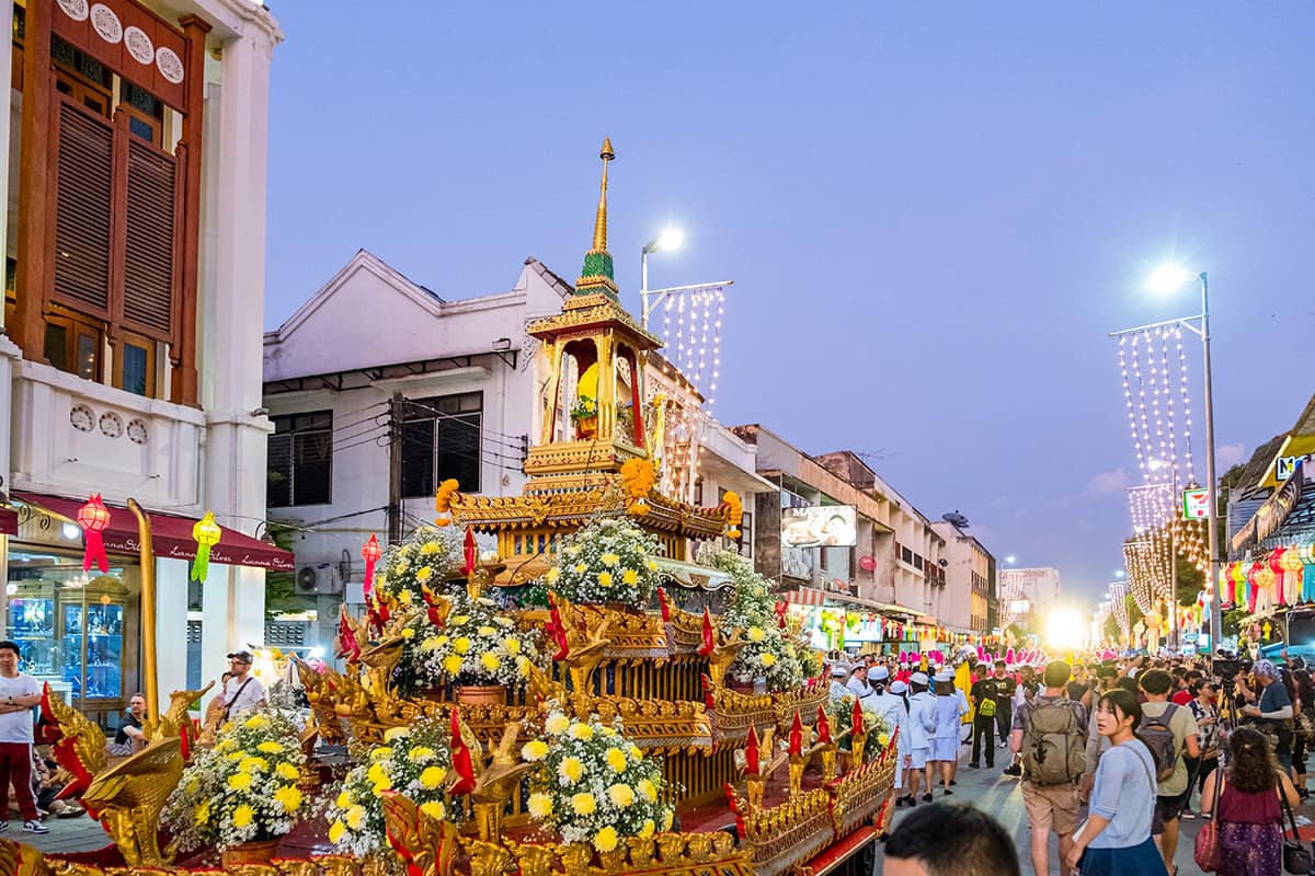 美しく飾りつけられた巨大ランタン山車や、タイの伝統衣装を身にまとった人たちのパレードも夜通し行われます。会場には、屋台もずらりと並んでいて、パッタイやカオソーイなどでお腹を満たしながら、お祭りを楽しむことができます。