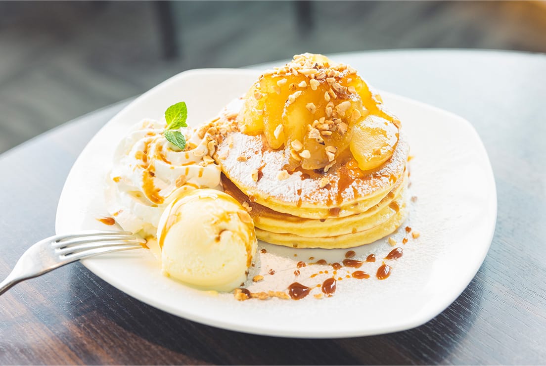 人気のパンケーキからは、キャラメルリンゴとローストアーモンドのパンケーキをチョイス。パンケーキは厳選した小麦粉と卵・バターをぜいたくに使用しており、お店の中で丁寧に1枚1枚焼き上げています。上にはキャラメリゼしたリンゴとバニラアイスが乗っていて、キャラメルソースとナッツがトッピングしてあります。