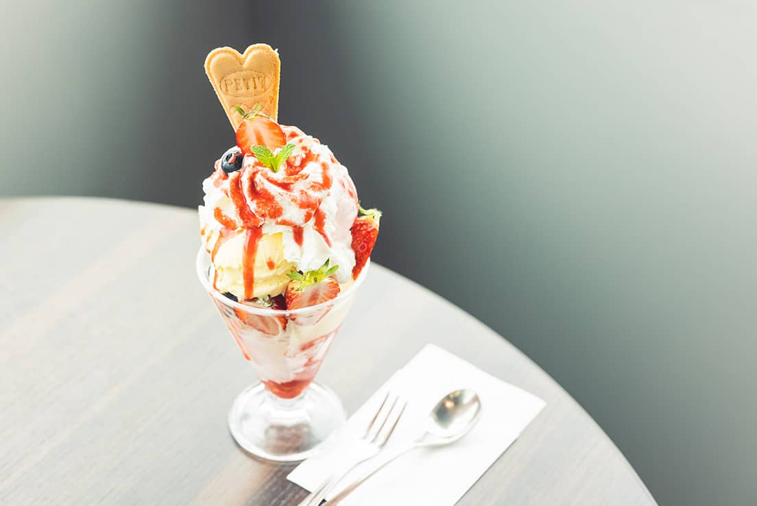 フルーツパフェは、いちご、バナナ、ブルーベリーとアイスクリームのパフェ。フルーツのラインアップは、通年で変わらないそうです。