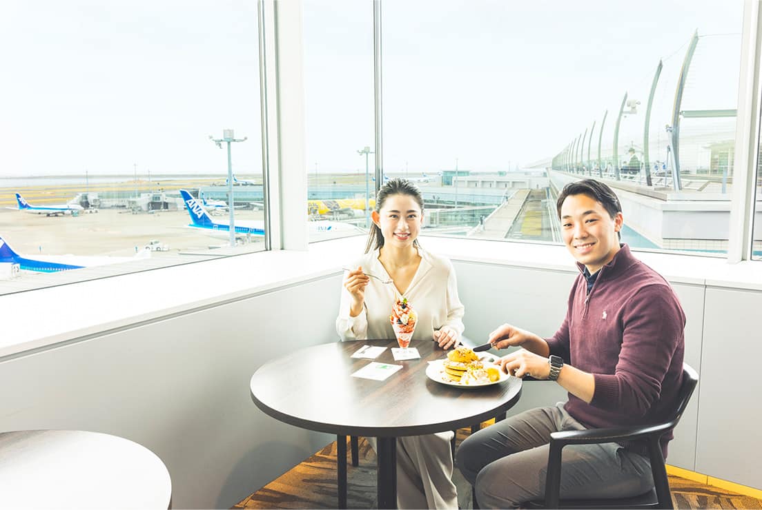 ショッピングを楽しんだあとは、甘いスイーツとともにティータイムを。5階のマーケットプレイスにある「アミーチデルテ」は、展望デッキに面したカフェで眺望が抜群です。朝早くから出発待ちのお客さんなどでにぎわっています。パスタやホットサンドのお食事からパンケーキなどのスイーツまで、さまざまなメニューが楽しめます。
