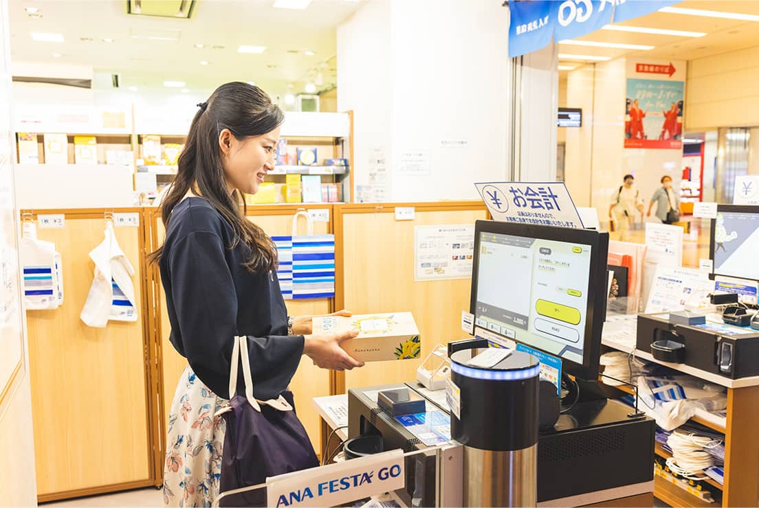 最後に、第2ターミナルの地下1階にある「ANA FESTA GO」に立ち寄ってお土産をゲット。空港売店「ANA FESTA」が出店しているこちらのお店は、無人決済システムを導入しており、お手軽にショッピングを楽しむことができます。専用の入口から入店し、ほしい商品を手に取って出口でタッチパネルの表示内容を確認。あとは支払いをするだけでショッピングが完了です。かなりスピーディーにお買いものができますよ。