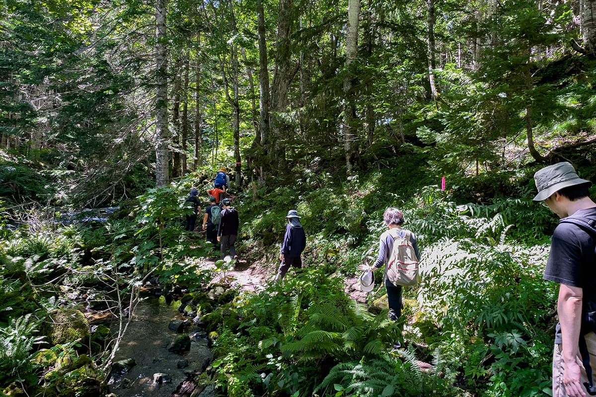 歩く途中にある地面の穴に手を入れると、湖で冷やされたひんやりとした風が通るのを感じられたり、かと思えば温泉のわく手塚沼が出現したり。夏なら、オオウバユリやエゾアジサイなどの珍しい植物を見ることもできます。じっくり歩いているうちに、景色を見るだけでなく、鳥の声や葉の擦れる音、植物を触った感覚にも集中していき、少しずつ五感が研ぎ澄まされていくのがわかります。